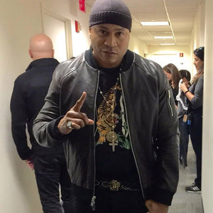 LL Cool J in our men's Black Leather military bomber jacket backstage for an awards show in Hollywood, California