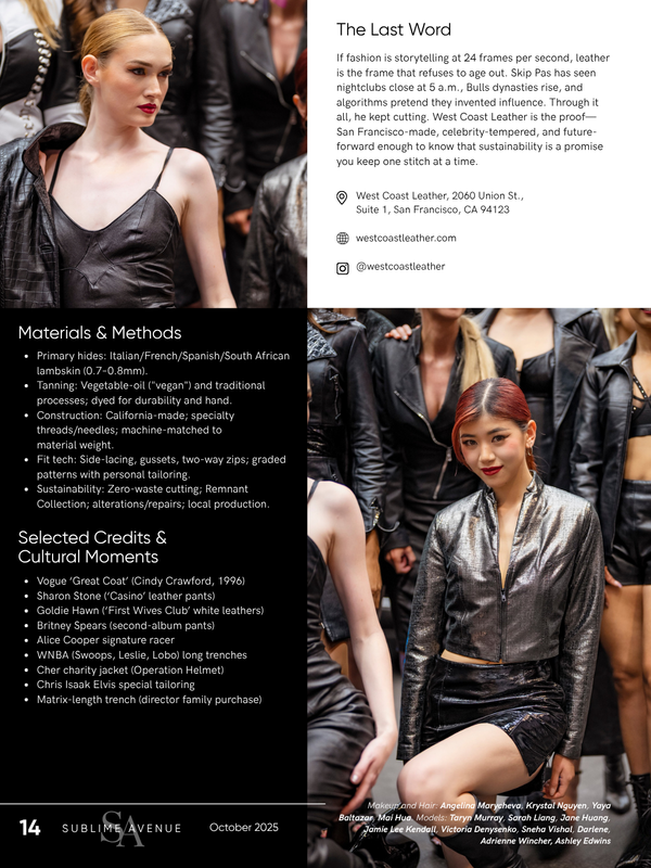 Designer Candice Cuoco first started her production for her collections with Fashion Director Skip Pas in 2015 and later appeared on Project Runway. This photo was requested by Vogue Magazine to show how we had one design from Candice and One from West Coast Leather which was our long white leather seven eights coat and her skirts with a flair and fantail made the magazine. Thanks to Candice for adding us to all her fashion that year stories and editorials that year.