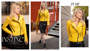 The photoshoot took place at the West Coast Leather store in San Francisco, located at 2060 Union Street. Jamie modeled the Asymmetric Motorcycle Jacket in Ferrari Yellow. Style # 6501 ($995) and the Pencil Skirt from the Library Collection ($495).